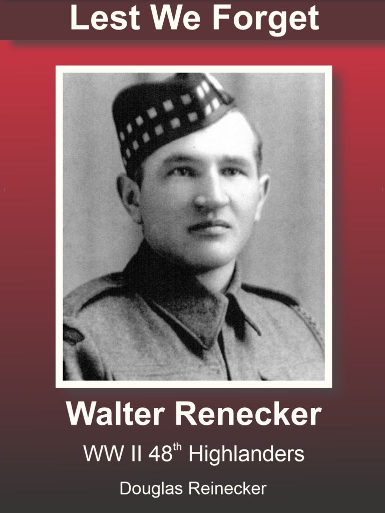 Walter Renecker was born in 1911 and grew up in the Sebringville area of Perth County, part of a local family whose roots were firmly planted in the community. When the world was again at war, he answered the call to serve and joined the 48th Highlanders of Canada, one of the country’s distinguished infantry regiments.